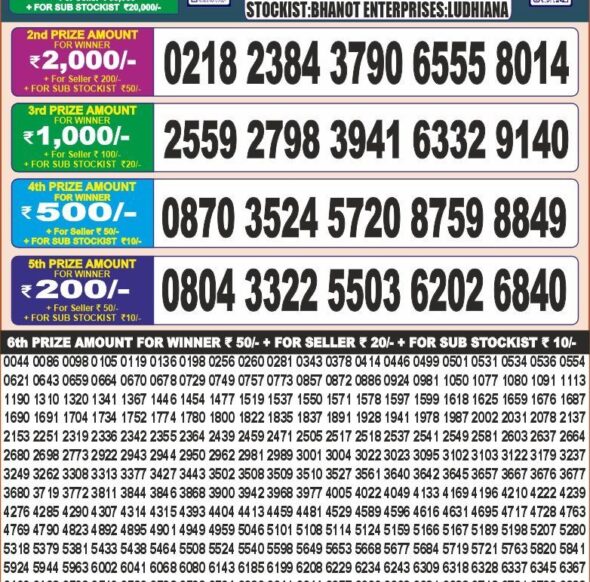 Latest Results September 18, 2025 Daily Result, Lottery Results Less than a minute RESULT OF DEAR(18-09-2025 AT 6 PM) M.R.P:-6₹ Select Date For Result Lottery Results, Monthly Result RESULT OF PUNJAB STATE DEAR 20 MONTHLY (24-06-2025 Daily Result, Lottery Results RESULT OF DEAR 100(24-06-2025 AT 5PM) M.R.P:-100₹ Daily Result, Lottery Results RESULT OF LABHLAXMI (24-06-2025 AT 4PM) M.R.P:-10₹ Daily Result, Lottery Results RESULT OF DEAR 10(24-06-2025 AT 1.30PM) M.R.P:-10₹ Daily Result, Lottery Results RESULT OF DEAR 1PM(24-06-2025 AT 1PM) M.R.P:-6₹ Daily Result, Lottery Results RESULT OF DEAR 8PM(23-06-2025 AT 8PM) M.R.P:-6₹ Daily Result, Lottery Results RESULT OF DEAR SUPER (23-06-2025 AT 7PM) M.R.P:-20₹ Daily Result, Lottery Results RESULT OF DEAR 10(23-06-2025 AT 7PM) M.R.P:-10₹ Daily Result, Lottery Results RESULT OF DEAR PB. 10(23-06-2025 AT 6PM) M.R.P:-10₹ 1 ...41 42 43 44 45 ... 221