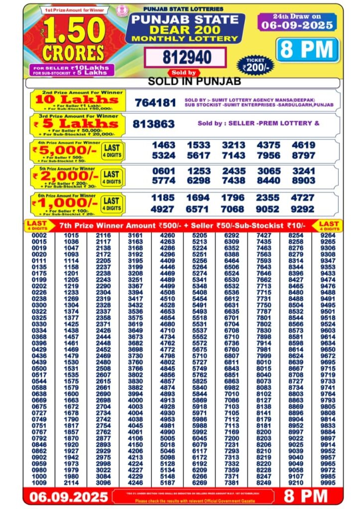 PUNJAB STATE DEAR 200 MONTHLY LOTTERY (06-09-2025 AT 8 PM) M.R.P:-200₹