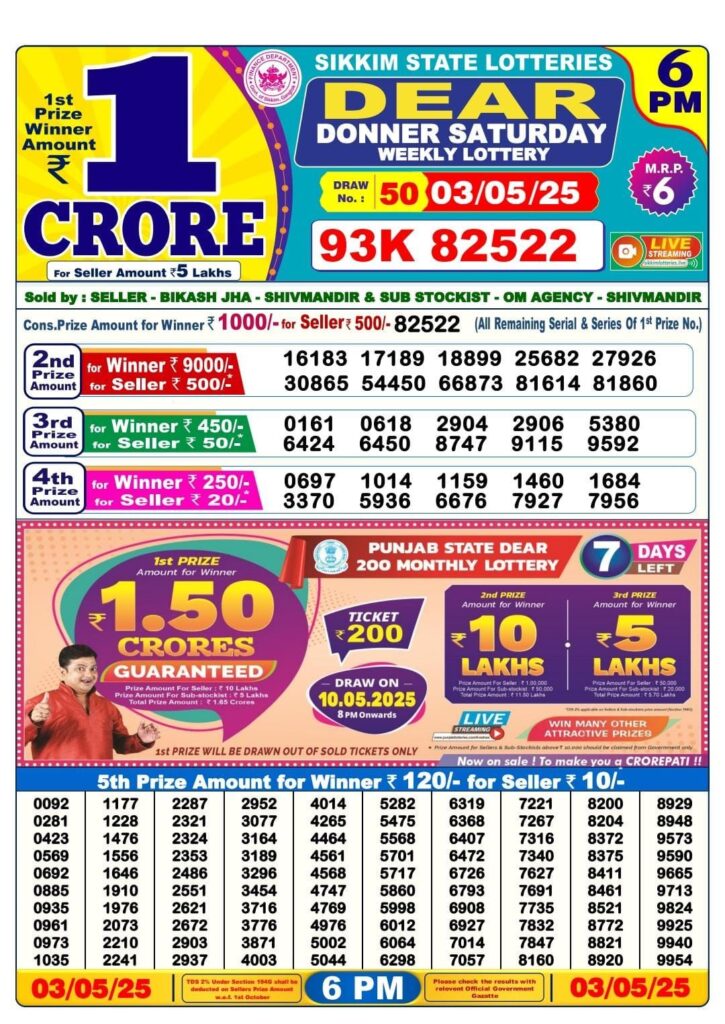 RESULT OF DEAR (03-05-2025 AT 6 PM) M.R.P:-6₹