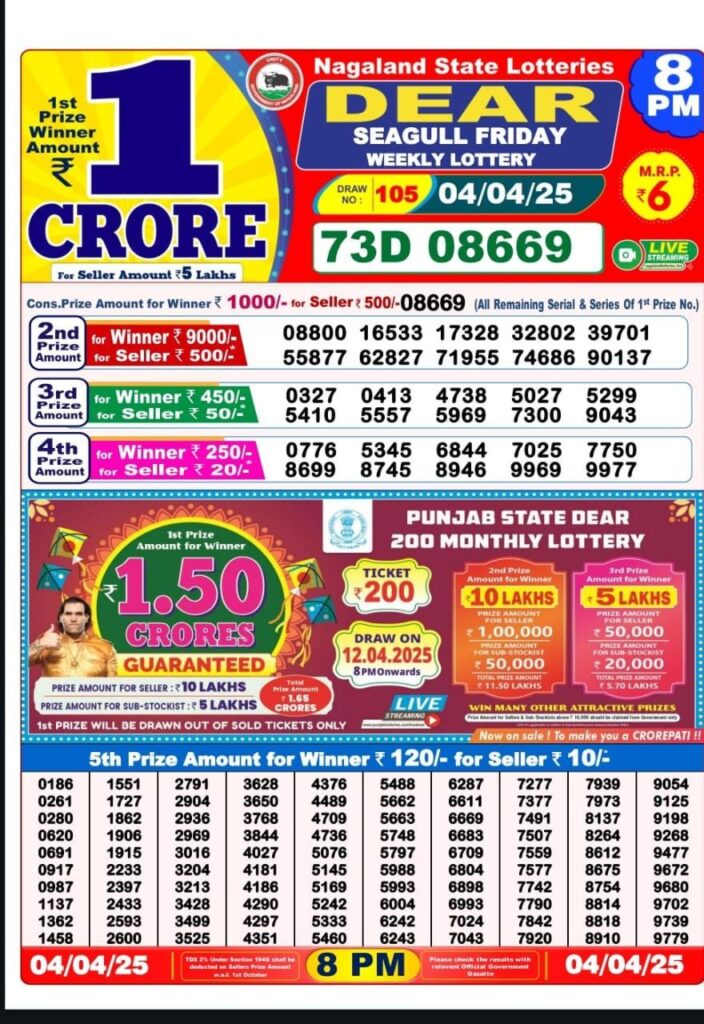 RESULT OF DEAR NAGALAND STATE (05-04-2025 AT 1 PM) M.R.P:-6₹
