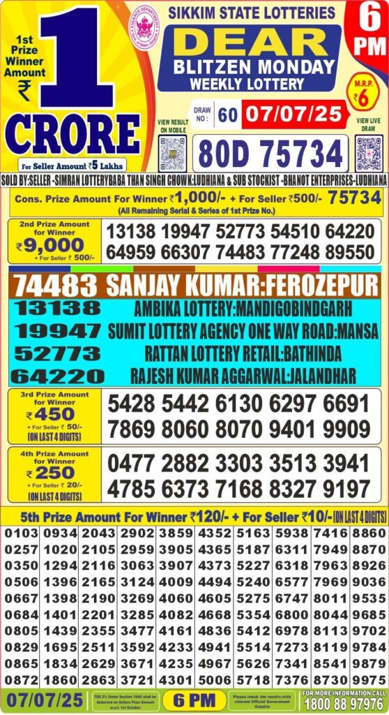 RESULT OF DEAR (07-07-2025 AT 6PM) M.R.P:-6₹