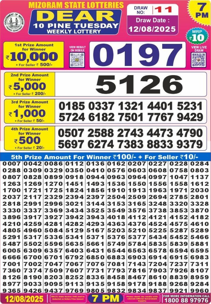 RESULT OF DEAR 10 PINE TUESDAY WEEKLY LOTTERY (12-08-2025 AT 7 PM) M.R.P:-10₹