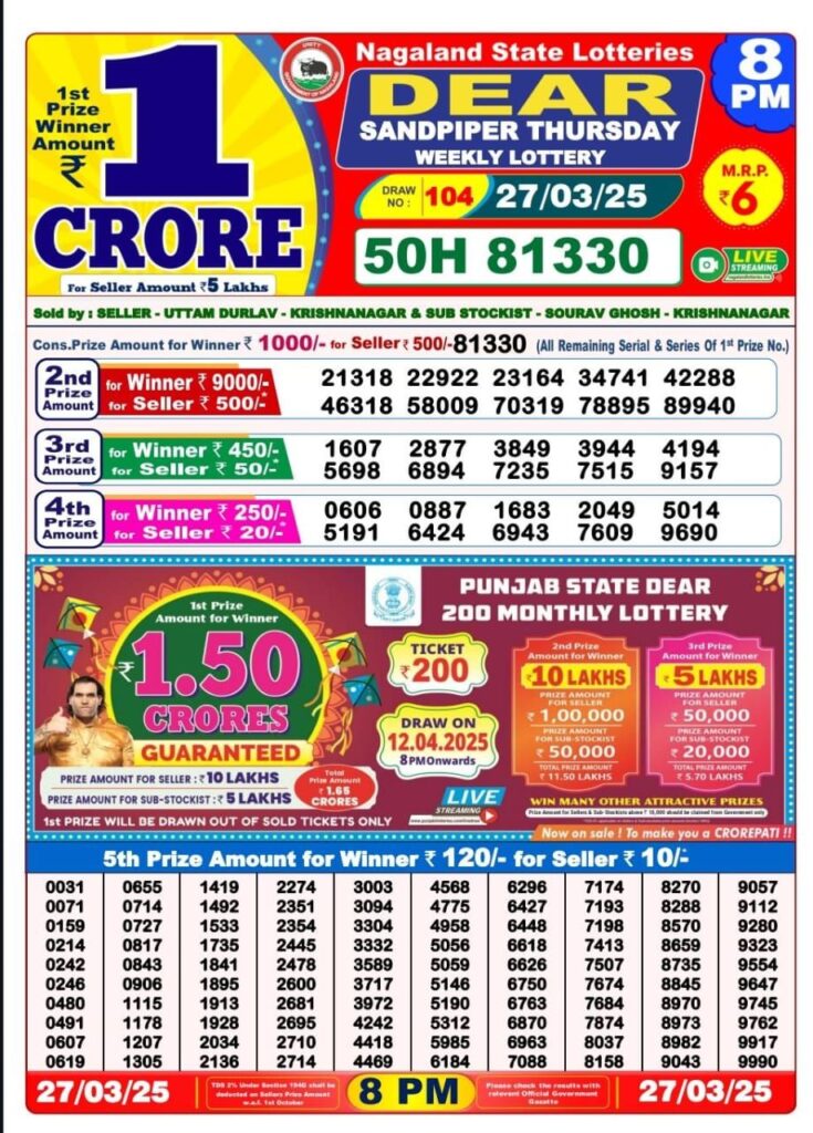 RESULT OF DEAR NAGALAND STATE (28-03-2025 AT 1 PM) M.R.P:-6₹