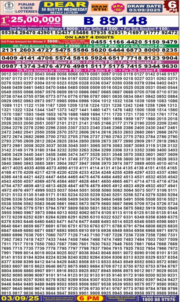 RESULT OF DEAR 50(03-09-2025 AT 6 PM) M.R.P:-50₹