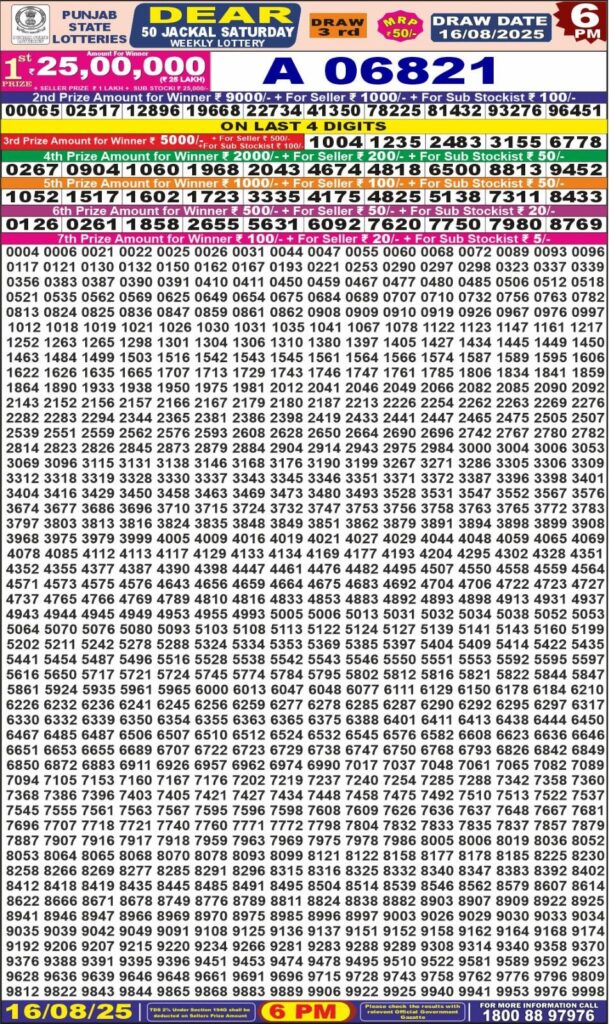 RESULT OF DEAR 50(16-08-2025 AT 6 PM) M.R.P:-50₹