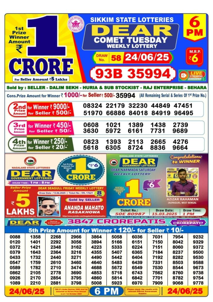 RESULT OF DEAR 6PM(24-06-2025 AT 6PM) M.R.P:-6₹