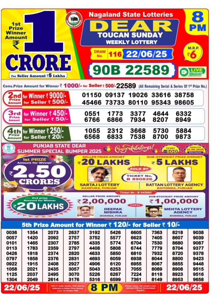 RESULT OF DEAR 8PM(22-06-2025 AT 8PM) M.R.P:-6₹