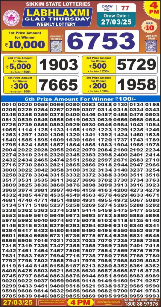 RESULT OF DEAR LABLAXMI (27-03-2025 AT 4 PM) M.R.P:-10₹
