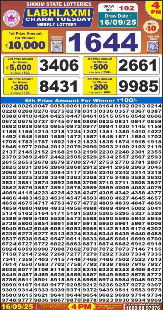 RESULT OF DEAR LABLAXMI(16-09-2025 AT 4 PM) M.R.P:-10₹