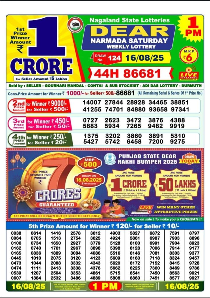 RESULT OF DEAR NAGALAND STATE (16-08-2025 AT 1 PM) M.R.P:-6₹