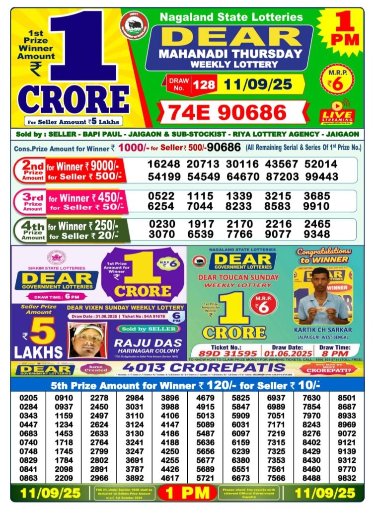 RESULT OF DEAR NAGALAND STATE(11-09-2025 AT 1 PM) M.R.P:-6₹