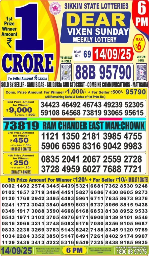 RESULT OF DEAR SIKKIM LOTTERY(14-09-2025 AT 6 PM) M.R.P:-6₹