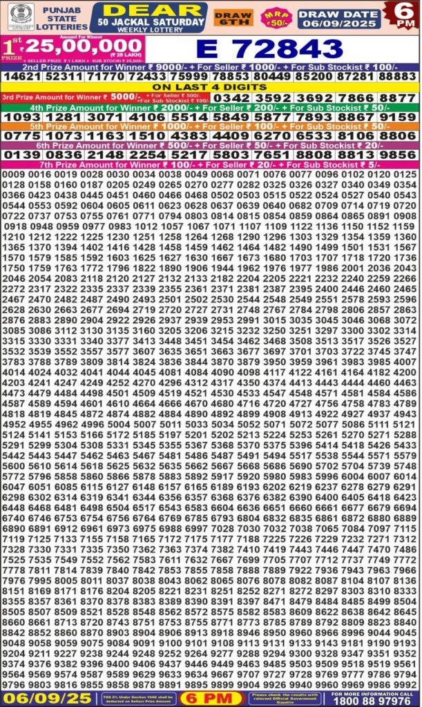 RESULT OF DEAR (06-09-2025 AT 6 PM) M.R.P:-6₹