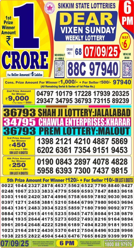 RESULT OF DEAR(07-09-2025 AT 6 PM) M.R.P:-6₹