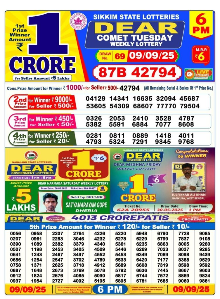 RESULT OF DEAR(09-09-2025 AT 6 PM) M.R.P:-6₹