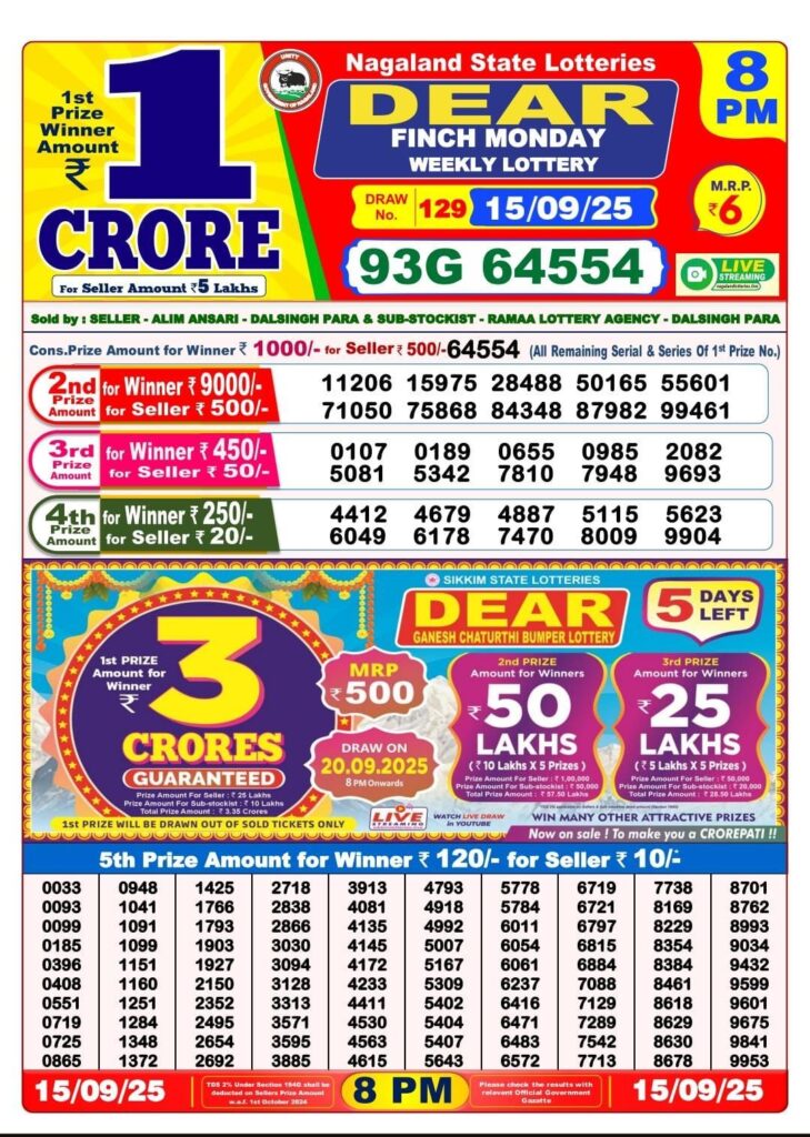RESULT OF DEAR NAGALAND STATE(16-09-2025 AT 1 PM) M.R.P:-6₹