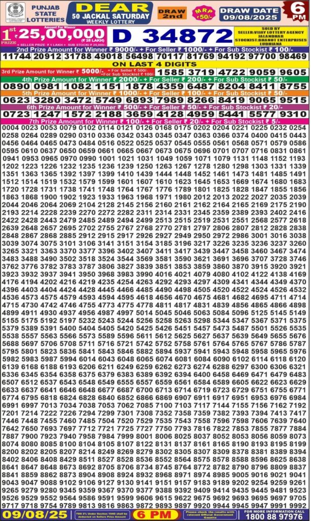 RESULT OF PUNJAB STATE DEAR 50(09-08-2025 AT 6PM) M.R.P:-50₹